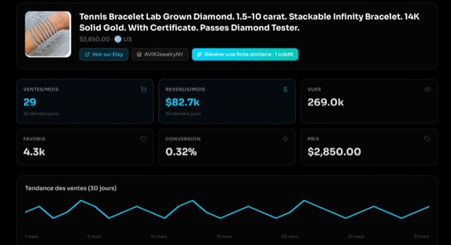 Audit complet d'un listing : SEO, tags, images, prix et recommandations.